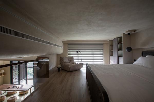 The entire space is adorned with low-saturated colors and features micro-cement and mineral paints to a primitive, rough, simple, and layered atmosphere. Casual and smooth curved lines are incorporated to subtly soften the original cold and solemn feeling of the space. The lighting layout is specially designed to eliminate the need for a main light. Floor-to-ceiling windows introduce natural light, while localized accent lighting adds fluidity, lightness, and a warm, misty aesthetic to the space.